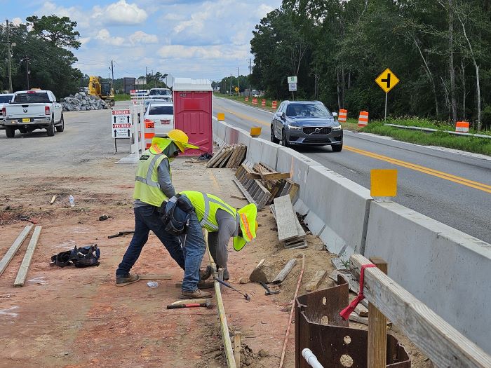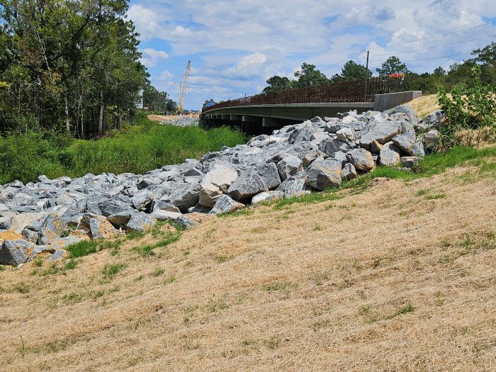 While some crews are finishing the bridges' approaches, other teams are completing work on erosion control measures and drainage systems. The project's designers and engineers have made sure that any water on these bridges will not only run off quickly, but it will run off in a direction and manner that doesn't allow water to collect and weaken the structures over time or to erode of the Satilla River's hillsides. Those huge rocks on the slope and even the new grass that has been laid are also erosion control measures as well as features that make the area more attractive.