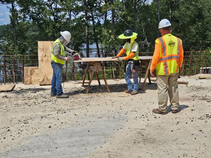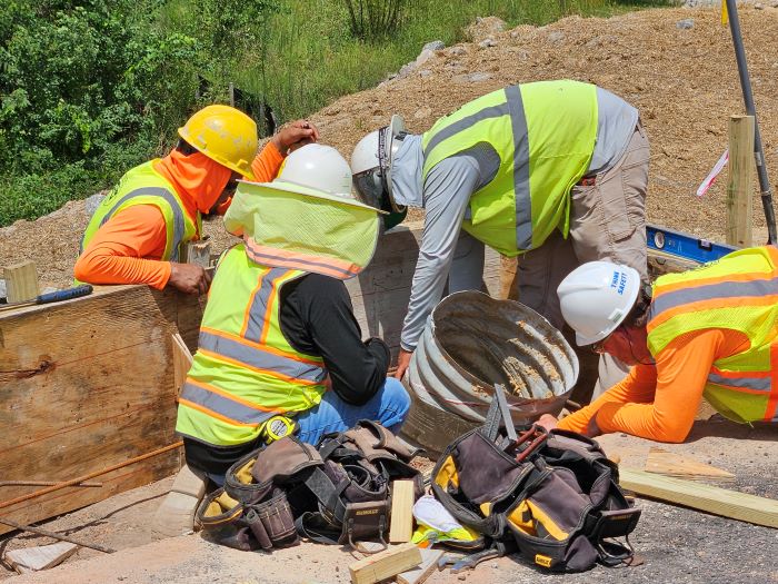 The approach on the east end is currently under construction, with a crew building the wooden forms that will later shape and set the lower concrete layer.