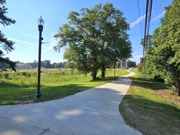 As for those pedestrian facilities, new sidewalk has been built in to connect a walkway entirely around the space bordered by West Moore Street, Elm Street, Woodrow Avenue and the former portion of Calhoun Street. To provide added safety for walkers and the surrounding area, elegant light poles are situated all along the sidewalk. They have banner-holders so the city can add signage as needed.