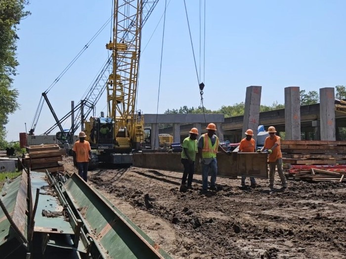 All of this is happening while the crews need to be focused on accurate measurements and maneuvering. The work underway involves driving the future bridge's piles, or long concrete columns that are forced down into the ground and will form part of the foundation. On the west end of the project, you can see piles that have already been driven. The two on the ends may look crooked, but they are at the exact angles necessary for the bridge's design. You can also see piles with a wooden framework on top. Soon, a team will pour concrete into that wooden form to build a cap, or wedge that will distribute the bridge deck's weight evenly across the piles.