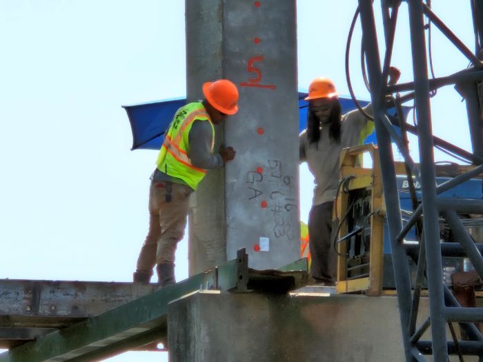 On the east end of the site, workers are driving test piles to make sure they know exactly how deep to push them into the earth. See those tall columns in the middle? Those are test piles. Some crew members are building a steel 'template' that will guide the piles into the ground at exactly the right location and angle. The girders themselves must be lifted with extreme care, as they can weigh hundreds of pounds per foot.