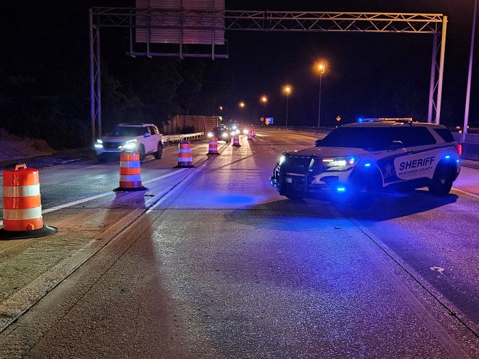 At 9:00 p.m., a crew started by setting out orange-and-white barrels to direct through-traffic to the on- and off-ramps, while officers with the Muscogee County Sheriff's Department and Columbus Police Department gradually blocked the interstate lanes and then monitored traffic through the area throughout the process. At times they also temporarily closed traffic to the newly-completed overpass, and a couple of times had to deal with a motorist who wasn't paying attention and managed to get around the barriers. All in all, however, the vast majority of drivers patiently and safely passed alongside the demolition.