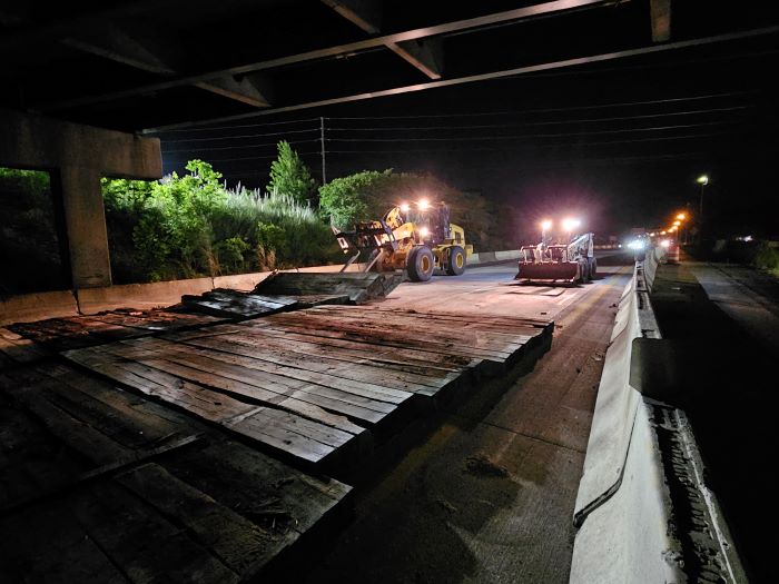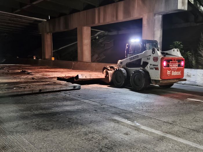 In addition to protecting people and their vehicles, the construction plan also ensured that the roadway underneath the bridge remained undamaged and able to be reopened to traffic at dawn. Part of the evening's prep work involved a two-worker team: one in a backhoe with a forklift who set loads of large wooden beams underneath the overpass, and another in a Bobcat with a grapple attachment who then lined up all the beams evenly. Huge chunks of concrete could then fall on the shock-absorbing beams and keep the road safe.