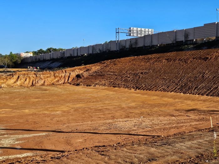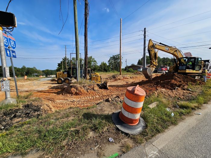 Ready to see something that really shows how much excavation has occurred here in recent months? Take a look at the area just to the west of the interstate. See that group of engineers and construction managers, having a field meeting there? Look at how much earth and rock the crews have removed at just that one location! If we go a bit more to the west on Old Cusseta Road, we see an excavating team continuing to carve out lanes that will eventually lead to a new ramp at Interstate 185.
