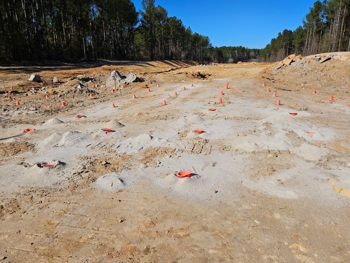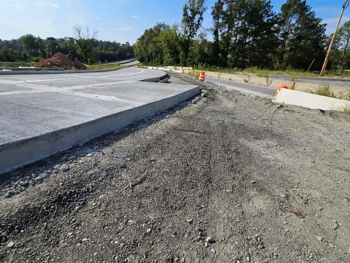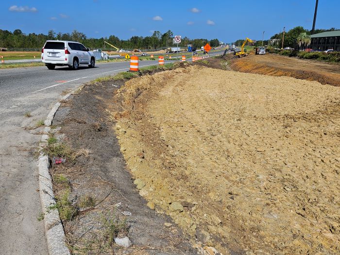 Heading north toward SR 16, you'll find locations of the cleared land that are peppered with tiny orange cones. Blasting crews are removing granite deposits in the right-of-way and the cones mark places where holes have been drilled.