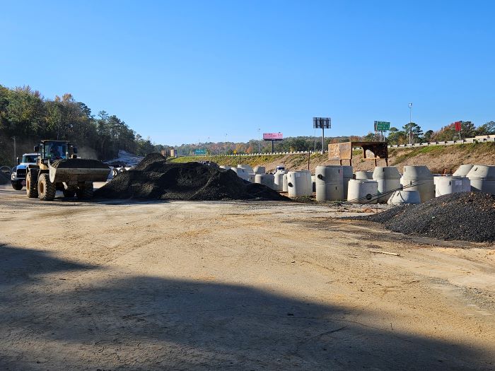 Contractors have set up a staging area just south of the current Farr Road intersection with Old Cusseta Road, adjacent to the interstate overpass. If you want to estimate how much is going on overall, just look at all the concrete pipe, gravel, asphalt, and dirt comes and goes daily. Looking just to the west under the Interstate 185 overpass, the future new lanes have been graded and show the larger roadway 'footprint' that will come with the new interchange and ramps.