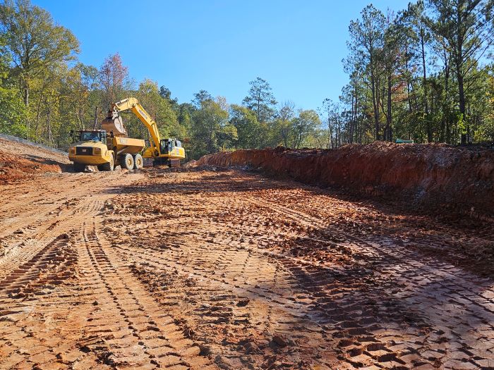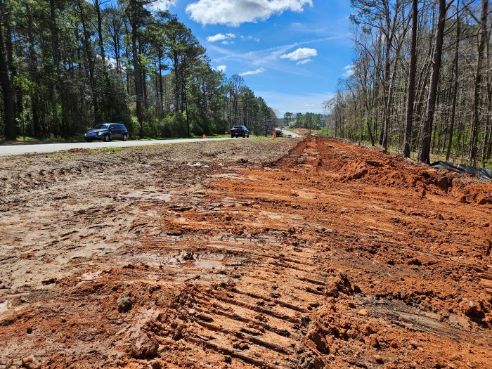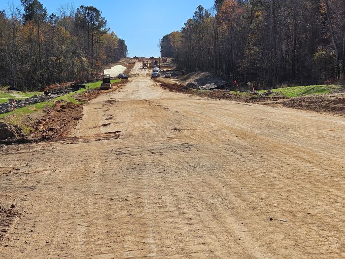 On just the other side of SR 16 - the project's midpoint - a number of crews are 'cutting and filling.' This area in East Central Georgia is full of rolling hills and the contractors need to remove or add dirt and rock as needed to ensure the new roadway corridor is brought to the final grade of the roadway. Here, teams are doing the 'filling', as dump trucks drive in and out, releasing enormous loads of dirt and then heading out to get more. Bulldozers and compacting rollers are in constant motion, spreading out the material that will be packed into a firm earth foundation. As we travel northward, you can see a long stretch that has been compacted into a flat, stable surface.
