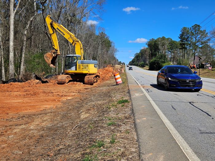 Now that the roadsides for this widening and improvements project have been largely cleared, the first task at hand is to move all utility lines that follow the edges of the current roadway. This includes telecommunication wires and cables, water and sewer pipes, and often power lines. This past week, a focus was on water lines with several crews located at various points along the construction corridor. The project's prime contractor, Robinson Paving of Columbus, brought in Gordy Construction Company of Columbus to lay out a new pipeline, then switch the water and sewer to the new system and remove the old pipes.
