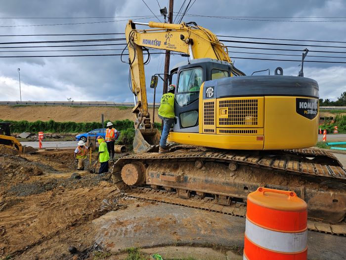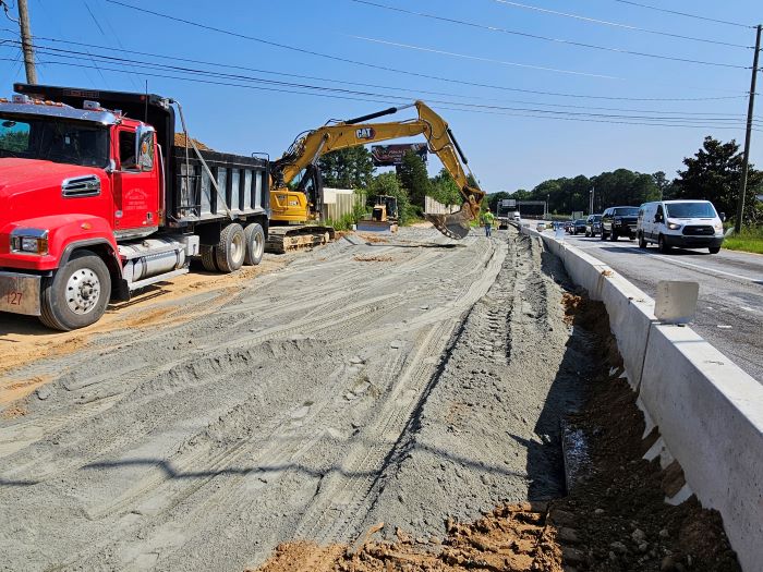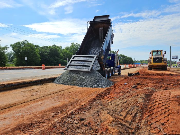 Just south of the bulldozers are two more teams: one is installing utility pipes, and another is continuing the extension of the new lanes, setting layers of gravel. Excavators are digging ditches and then burying the new concrete water and sewer lines. Dump trucks are going in-and-out of the roadway, pouring mountains of gravel and then heading out for more. You'll also see workers throughout the work zone, directing the large vehicles, helping to spread gravel or keeping watch over the scene for safety.