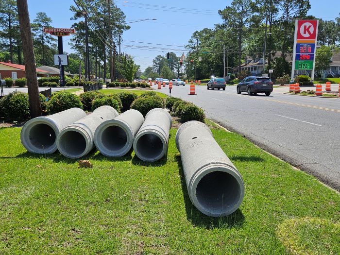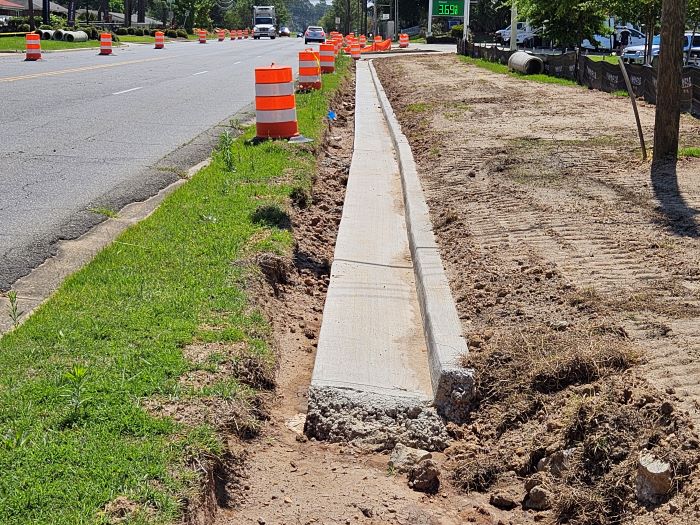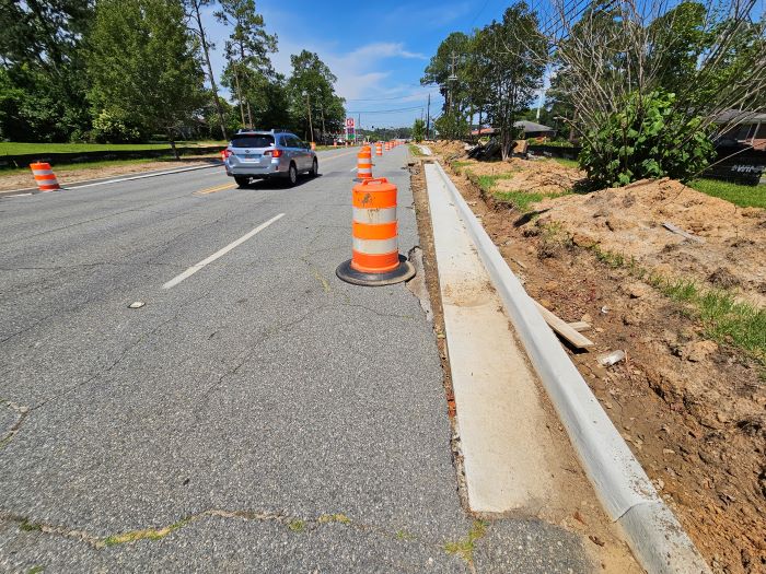 Whenever we start a new road project, many people are surprised that our contractors have many activities that don't seem to involve the actual roadway. For the 8th Street widening project in Tifton, work has started on the roadsides with teams building new concrete curb and gutter, moving utility lines and clearing the spaces that will soon be part of the new lanes. If you enter 8th Street from the Interstate 75 interchange, you'll see the TIA project sign right away with all the orange and white barrels lined up along the work zone. You'll also see some new curb and gutter that shows where the new roadside boundaries will be.
