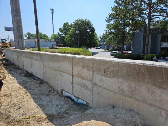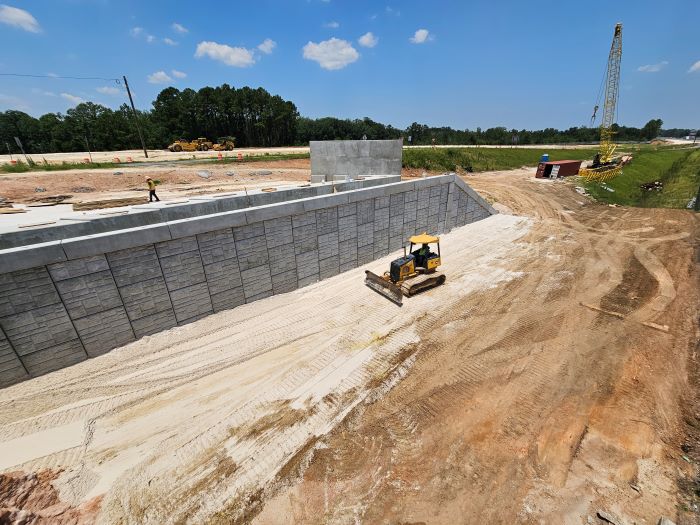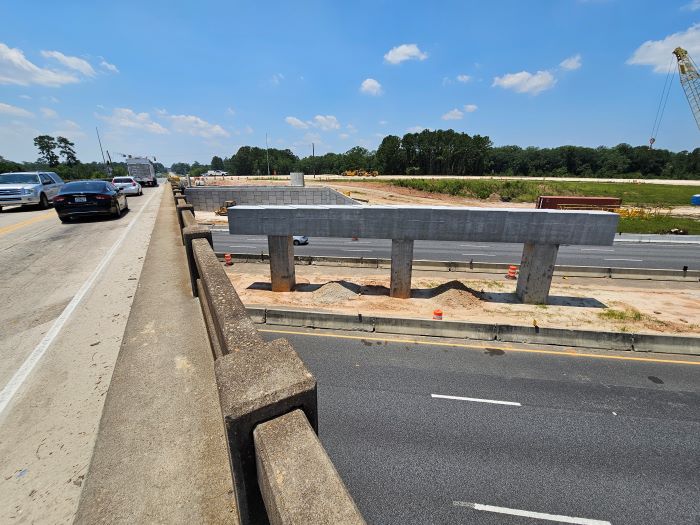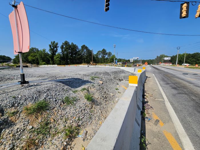 While the interchange itself is grading up, there are other jobs underway through the length of the project. For example, concrete crews recently built a safety barrier wall in front of the entrance to Patriot Place Apartments.