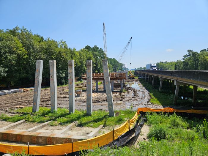 All of this is happening while the crews need to be focused on accurate measurements and maneuvering. The work underway involves driving the future bridge's piles, or long concrete columns that are forced down into the ground and will form part of the foundation. On the west end of the project, you can see piles that have already been driven. The two on the ends may look crooked, but they are at the exact angles necessary for the bridge's design. You can also see piles with a wooden framework on top. Soon, a team will pour concrete into that wooden form to build a cap, or wedge that will distribute the bridge deck's weight evenly across the piles.