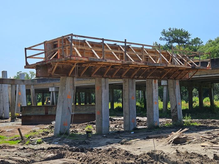 A lot has happened since we last visited this project in April, as crews get ready for the next big step in their construction process: bringing in and setting beams on the new concrete columns and caps (a cap is the platform that goes across the top of the columns and helps distribute weight from the beams to the columns - the more you know!). In recent weeks, workers finished the new central columns and cap, and now they're completing wooden forms so they can pour the concrete that will be the cap on the east-end abutment. Project engineers believe the beams will be set later this summer - we'll send out a social media alert and a news release to let everyone know when that will be happening.