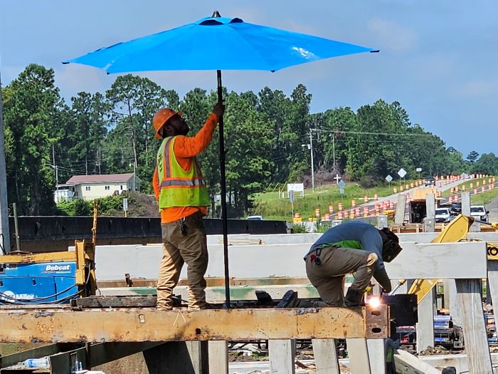 While one group is readying a girder, another is perched high above the riverbank. A welder is preparing their platform to fit the waiting girder. The crew use an umbrella to ensure the sun's bright overhead glare doesn't interfere with the shaping. Occasionally, a test pile is lifted up by another crane so that the workers can check how well their metal template is coming together. It must be exactly right, or the piles won't be in their proper places and the bridge's foundation won't be as stable.
