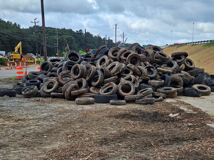 You'll see some interesting piles of things throughout the work zone. On one side of the roadway, huge concrete pipe is stacked up, waiting to be buried as utility crews move the water lines throughout the area. On the other side is an enormous pile of tires that had been scattered along the side of the road. As clearing teams went through the work zone creating this section of the project footprint, they had to sort out lots of litter debris as well as brush and grass.